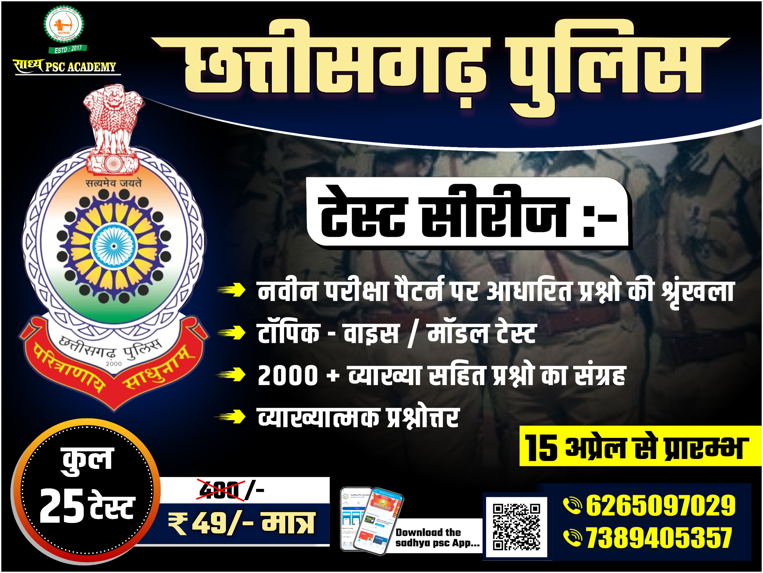CG POLICE (छ.ग .पुलिस) टेस्ट सीरीज A "test series" refers to a set of practice tests or mock exams designed to help students prepare for competitive exams by simulating the real exam environment and allowing them to assess their strengths and weaknesses. Test series aim to: Evaluate preparedness and understanding of the subject matter. Improve time management skills during exams. Enhance answer-writing skills (especially for exams with essay or short answer sections). Boost confidence and reduce exam anxiety. Useful for- CG POLICE (छ.ग .पुलिस) Exam Contact for more information regarding the course. 6265097029,7389905357,8962555357